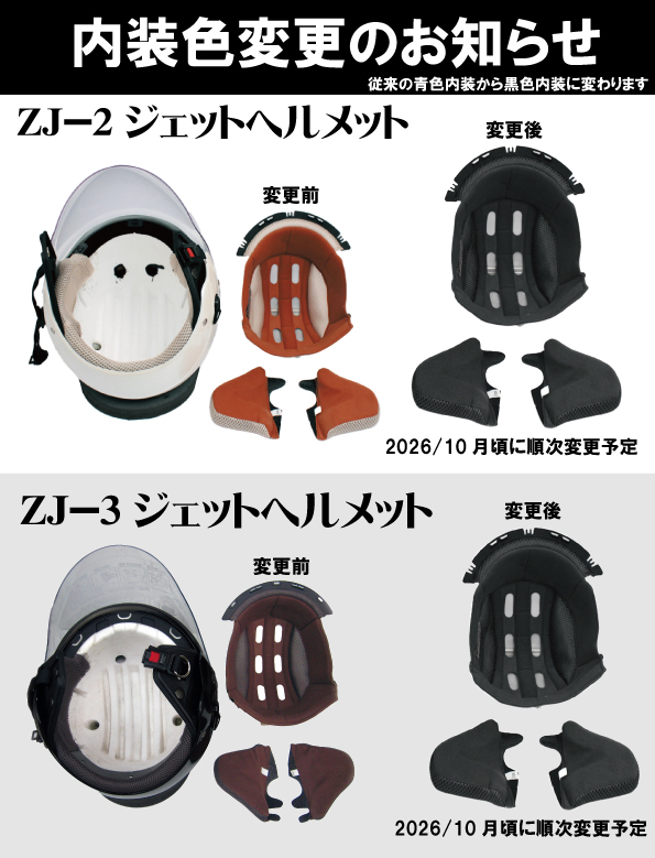 勝手ながら、ZACKシリーズジェットヘルメット『ZJ-2』『ZJ-3』の内装色の変更を実施させて頂きます